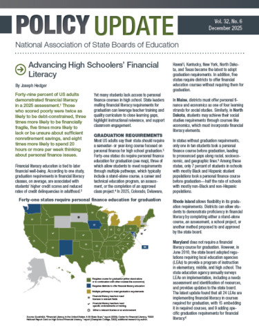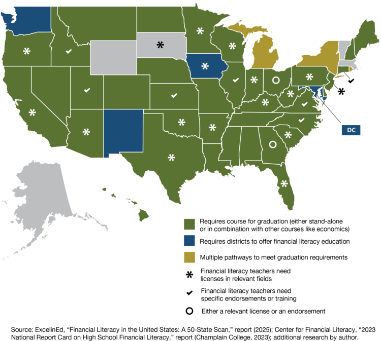 [4] ExcelinEd, “Financial Literacy in the United States: A 50-State Scan,” report (2025); Center for Financial Literacy, “2023 National Report Card on High School Financial Literacy,” report (Champlain College, 2023); additional research done by author.