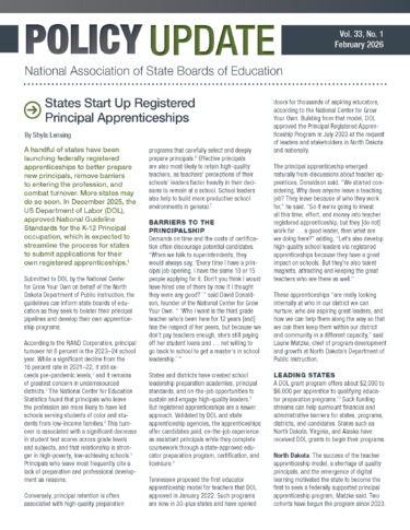 A handful of states have been launching federally registered apprenticeships to better prepare new principals, remove barriers to entering the profession, and combat turnover. More states may do so soon. In December 2025, the US Department of Labor (DOL), approved National Guideline Standards for the K-12 Principal occupation, which is expected to streamline the process for states to submit applications for their own registered apprenticeships.[1]