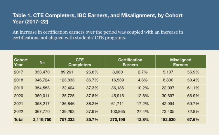 But the rate of students who earned IBCs that were misaligned increased from 57 percent to 73 percent of certification earners (table 1). We define a misaligned IBC as one earned outside the subject area of the CTE program a student completed—for example, when an education program completer earns a certified veterinary assistant license.