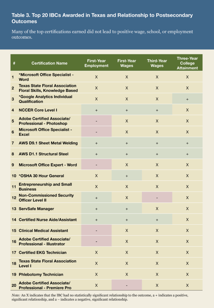 To better understand whether earning an IBC in high school gives students advantages in the labor market or in postsecondary education, we linked data on IBCs earned with students’ postsecondary outcomes. We synthesize the estimated value of the 20 most commonly earned IBCs in tables 2 and 3.